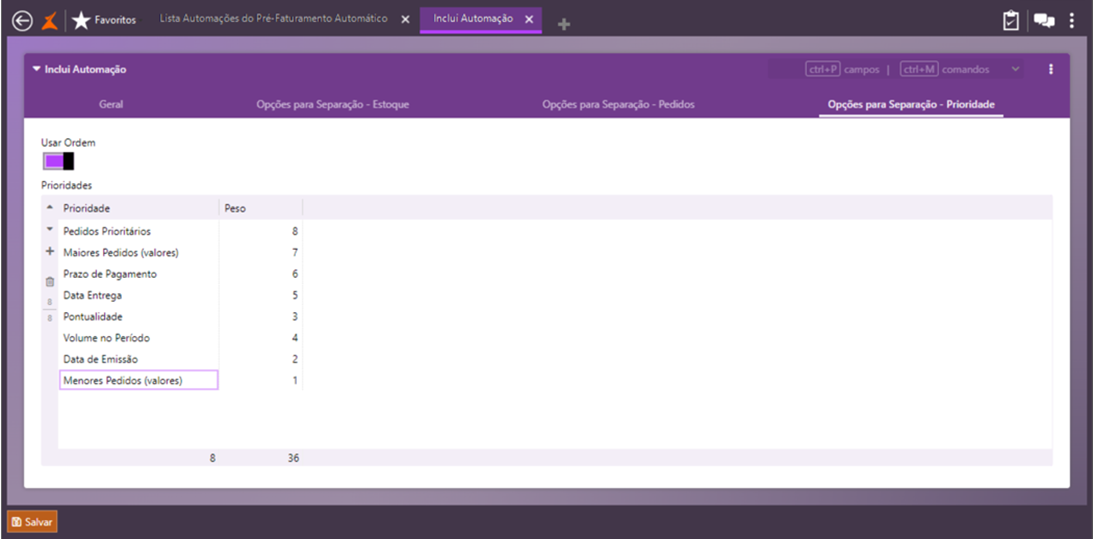 O sistema seguirá a ordem de prioridades definida nesta tela, para executar a separação dos pedidos de venda.