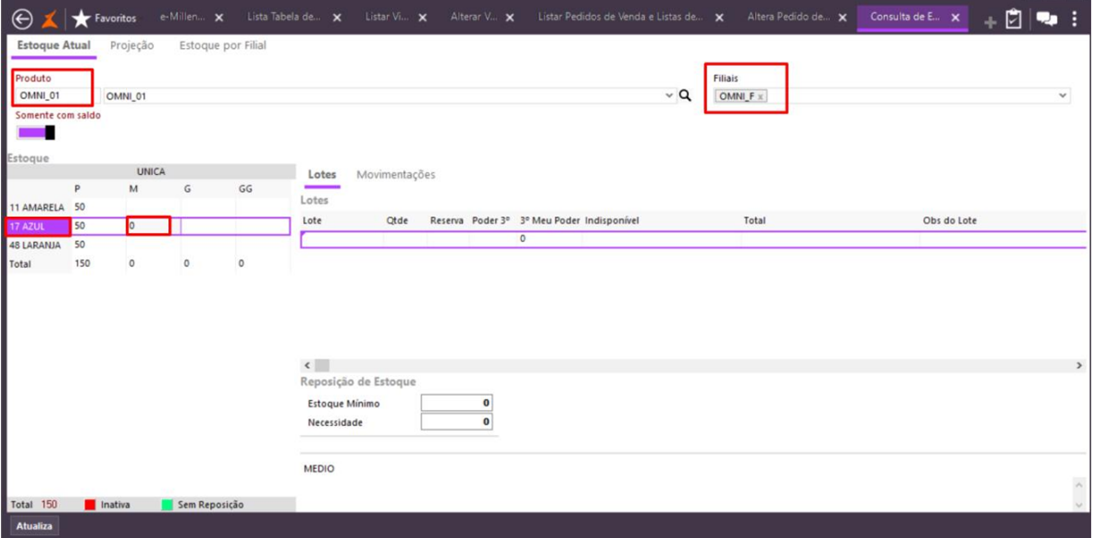 Em Logística > Estoque > Consulta Saldo, observe que não há quantidade do produto em estoque.