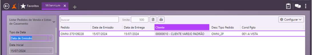Em Vendas > Pedido de Venda, faça uma consulta e verifique a inclusão de um pedido para o item selecionado na tela do PDV OMNI.