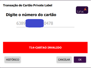 Caso o cartão ou CPF fornecidos não sejam localizados na plataforma, a operação não poderá ser finalizada e a ação será bloqueada.