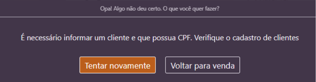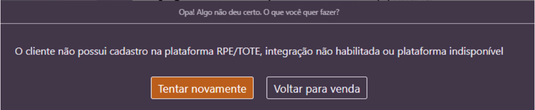 Caso a venda ocorra com um cliente que tenha CPF, porém não tem cadastro na plataforma RPE/TOTE, ou integração não está marcada nas configurações gerais, ou falha momentânea da API da RPE/TOTE, o sistema bloqueará: