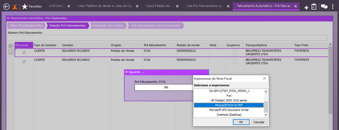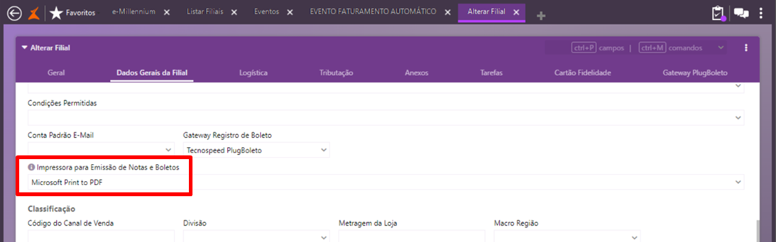Impressão de nota e boleto com impressora configurada no cadastro da filial