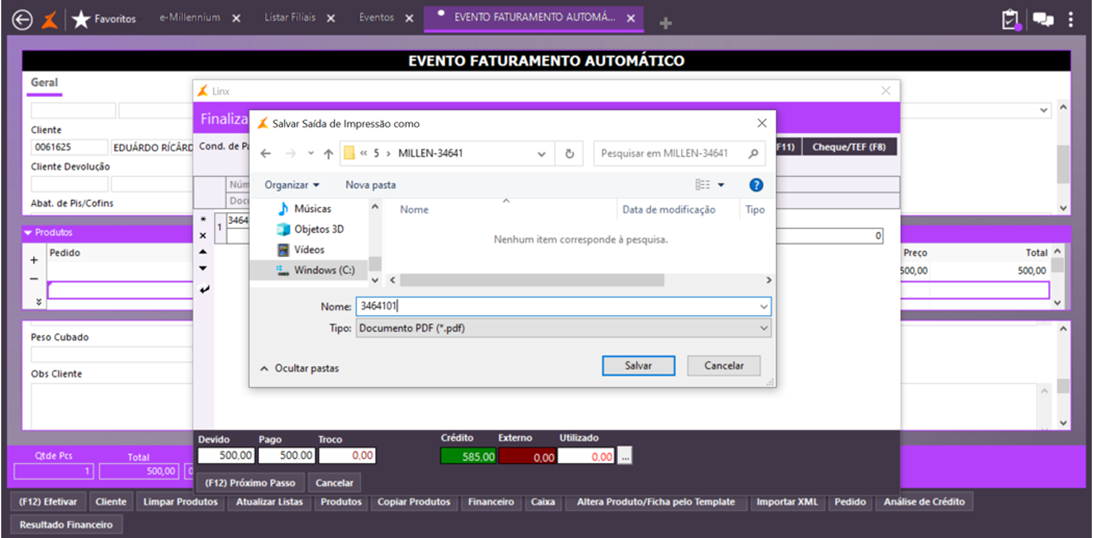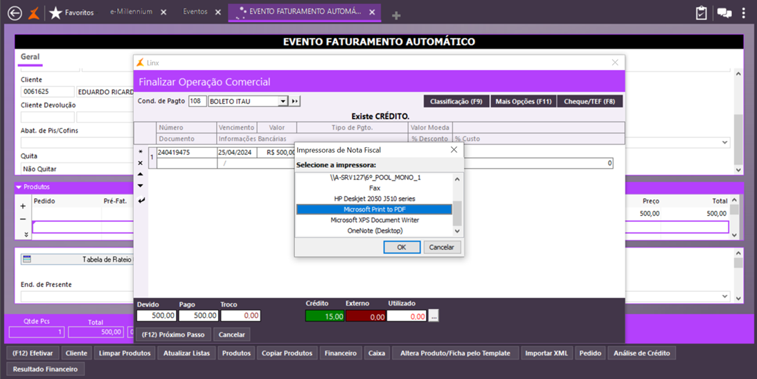 A impressora selecionada e o usuário que fez a seleção serão armazenados pelo sistema e na próxima emissão de nota ou boleto que o usuário realizar, o sistema carregará a última impressora selecionada por ele.
