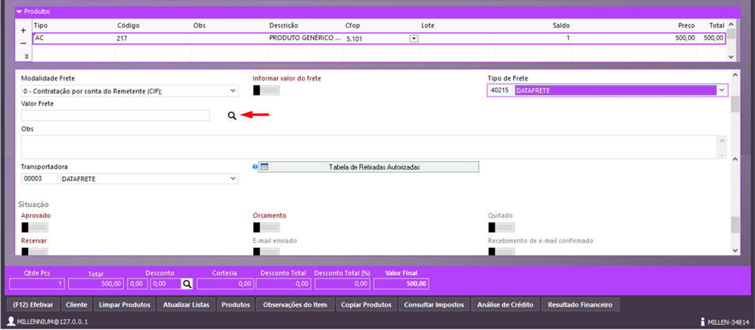 - Clicar na lupa para fazer a consulta no gateway de frete.