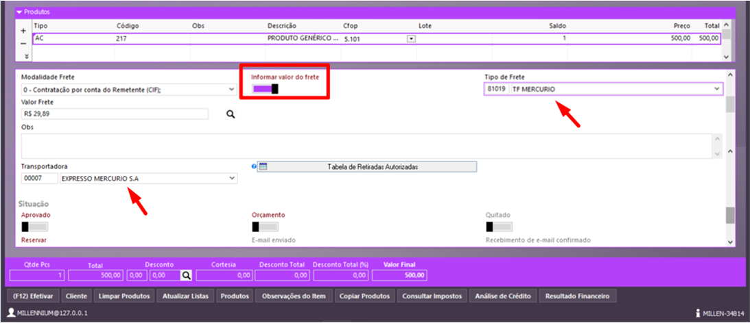 Ao selecionar a transportadora, o sistema carrega as informações atualizadas no pedido de venda. Perceba que a transportadora e o tipo de frete foram alterados e o campo Valor Frete foi preenchido.