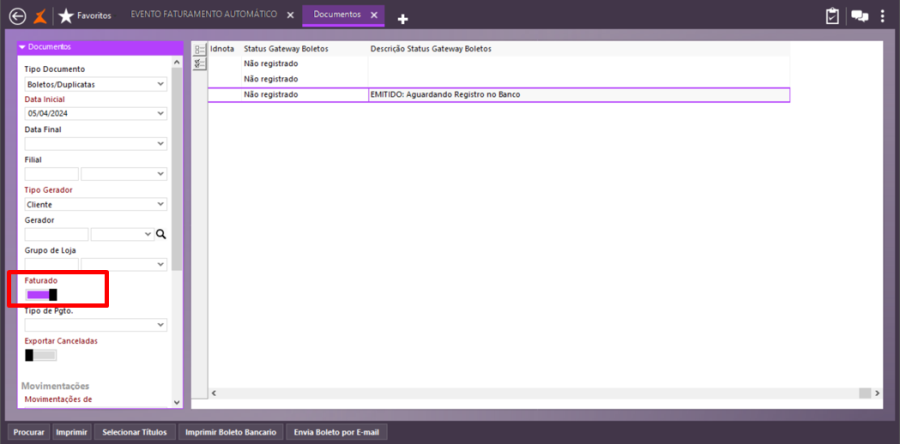 As ocorrências de registro de boleto serão gravadas no banco de dados para exibição nas telas de consulta de Movimentação, Impressão de Documentos, Lista de Títulos a Receber e Alteração de Títulos, juntamente com o status do boleto e a descrição de erro de registro, se ocorrer erro.