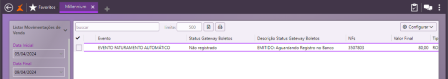Em Vendas\Consulta Movimentações, também poderá ser visualizado o status da emissão dos boletos.