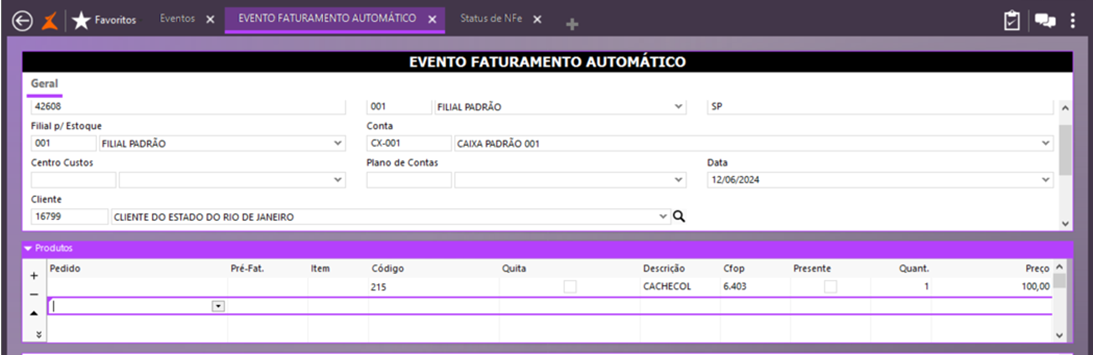 Em Vendas > Movimentações, finalize o evento e efetive. Após a emissão da NFe, é possível verificar no arquivo xml como ficou o preenchimento da tag.