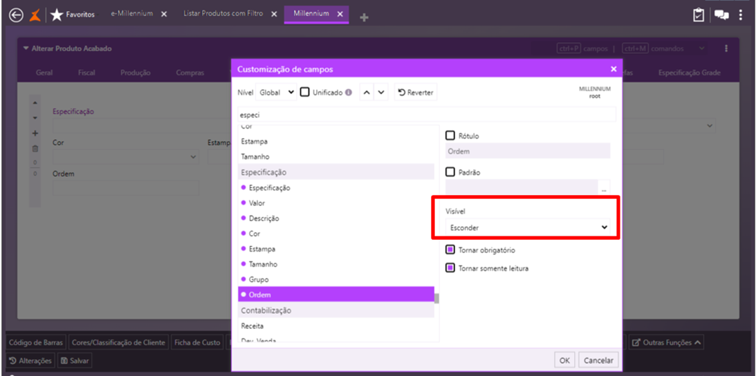 Ocultar aba Especificação