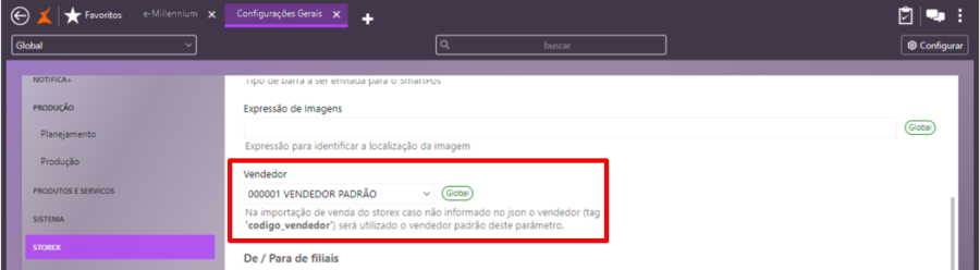 - Na pasta Storex, configure o parâmetro Vendedor, selecionando o vendedor padrão criado para ser usado com o recurso.