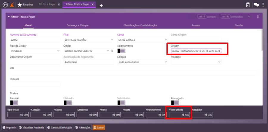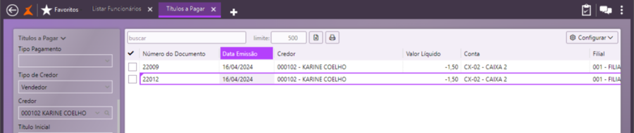 Em Financeiro\A Pagar, faça uma consulta e verifique a inclusão do título a pagar referente à comissão sobre a venda que a funcionária/vendedora Karine realizou.