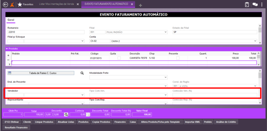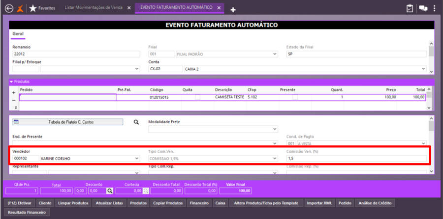 Para que o sistema possa realizar cálculo de comissões nas operações de vendas, é necessário que o evento esteja acessando as informações de vendedor e a respectiva comissão.