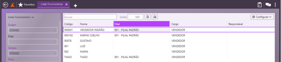 Em Utilitários\Empresa\Funcionários, faça uma consulta e observe que existe um registro para o vendedor padrão cadastrado no e-Millennium, que será vinculado na movimentação de venda gerada pela integração.