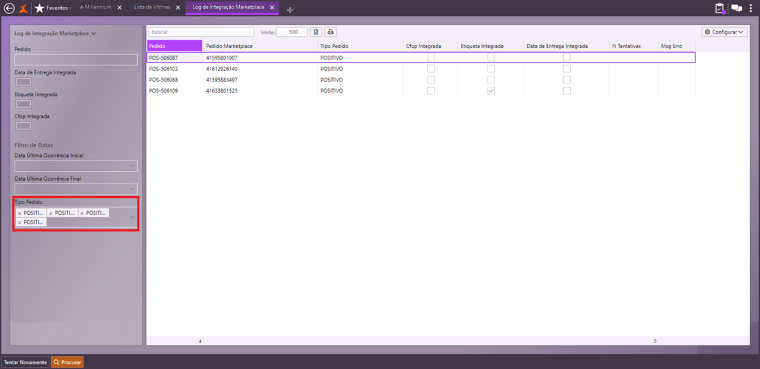- Será aberta a página Log de Integração Marktplace. Realize a configuração de filtragem, utilizando o campo Tipo Pedido.