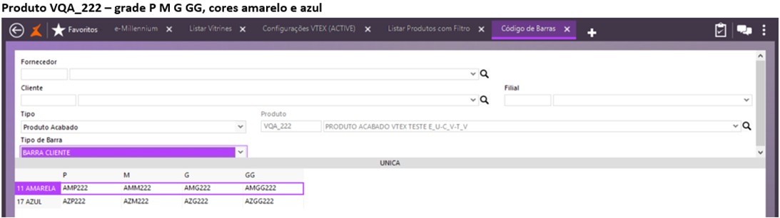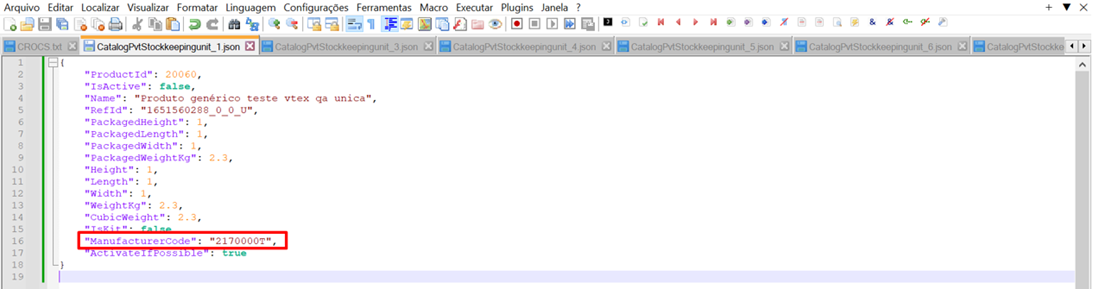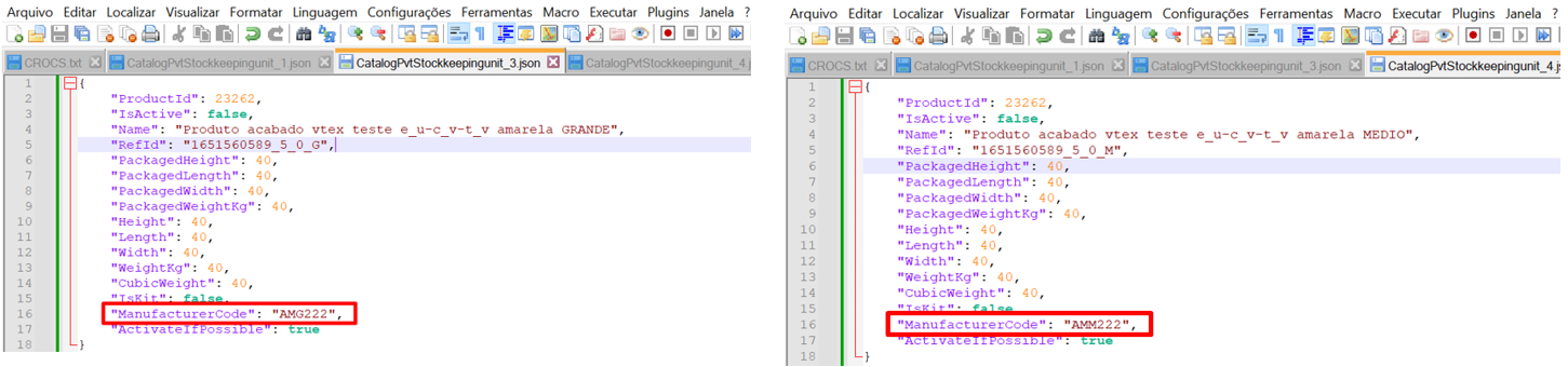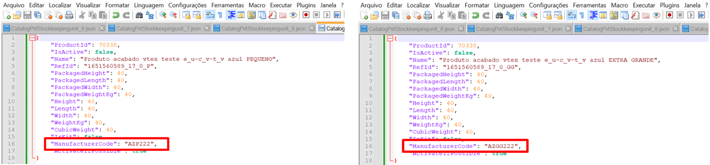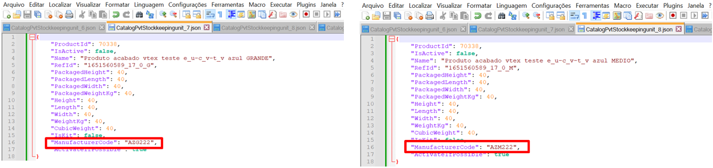 Preenchimento do campo Manufacturecode no envio do produto VQA_222 para seus vários SKUs