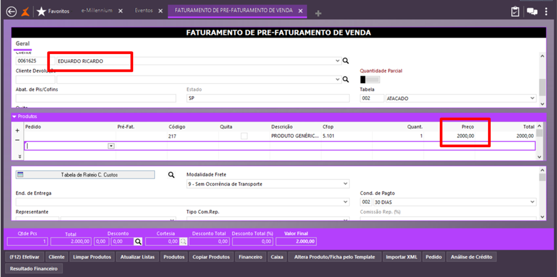 Em Vendas > Movimentações, executar a operação de faturamento de venda e emissão de nota fiscal para o cliente.