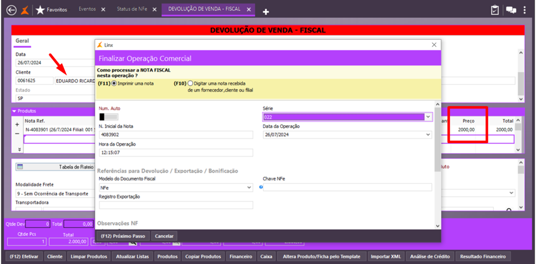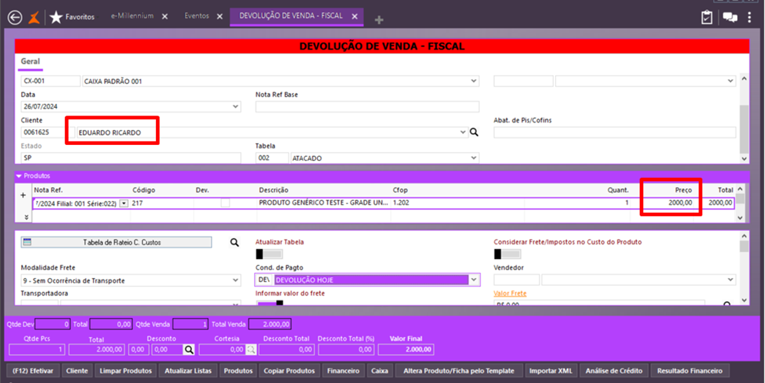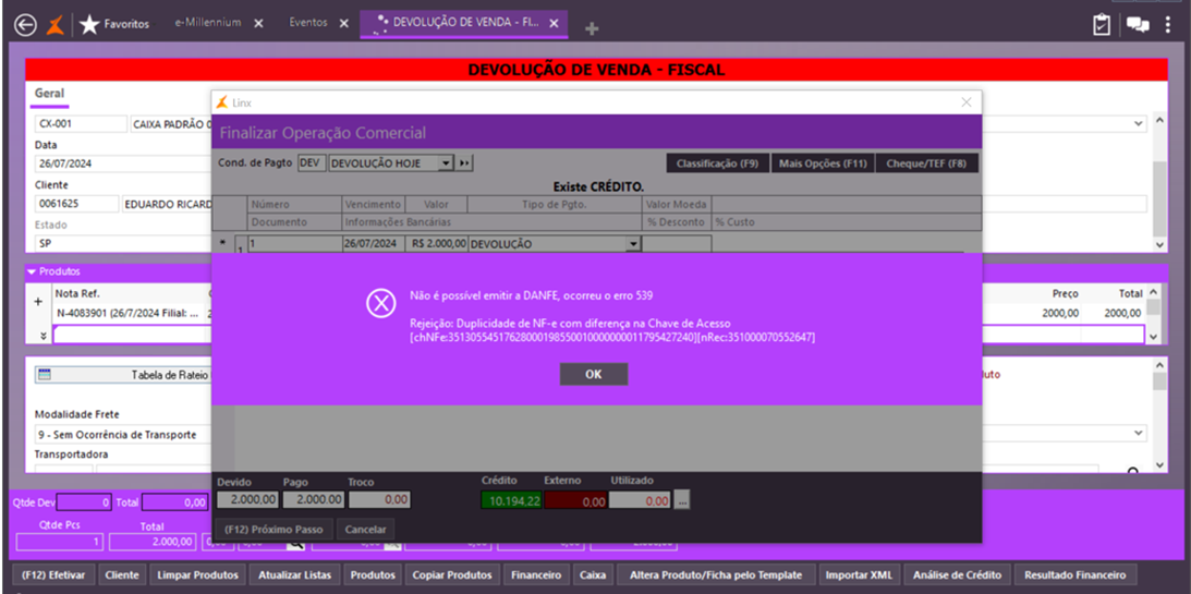 2.Realizar movimentação de devolução da venda (cuja nota será rejeitada pela Sefaz)
