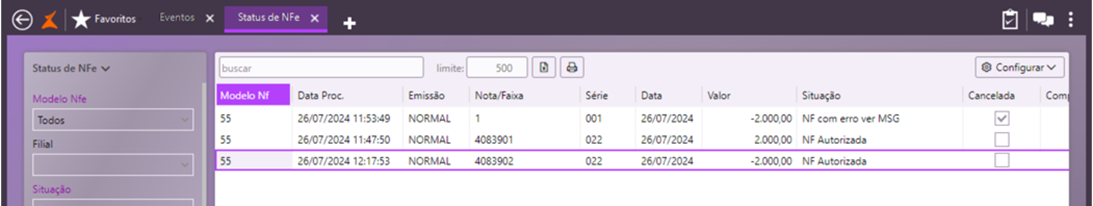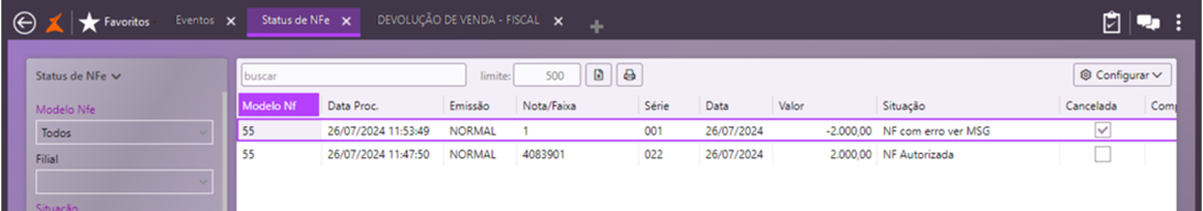 Em Vendas > Status NFe, faça uma nova consulta e veja que há uma nota de devolução autorizada pela Sefaz.
