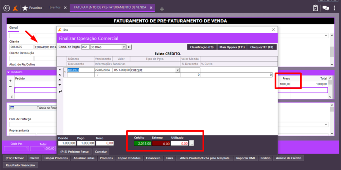 Em Vendas > Movimentações, ao realizar uma nova venda para o cliente, perceba que o crédito de R$ 2.000,00 ainda não está disponível para ser aproveitado, uma vez que foi gerado apenas como previsão.