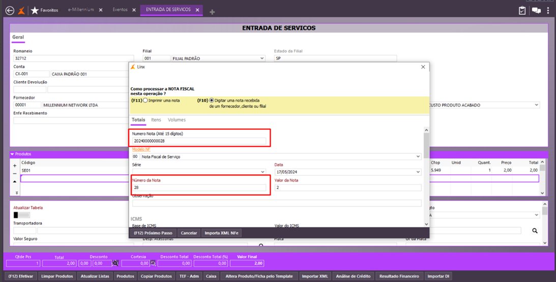 Na finalização do evento de entrada de serviço, selecione a opção Digitar uma Nota Recebida, note na imagem que foi adicionado um novo campo para informar a numeração, sendo um obrigatório (o campo que já existia) e um campo opcional.