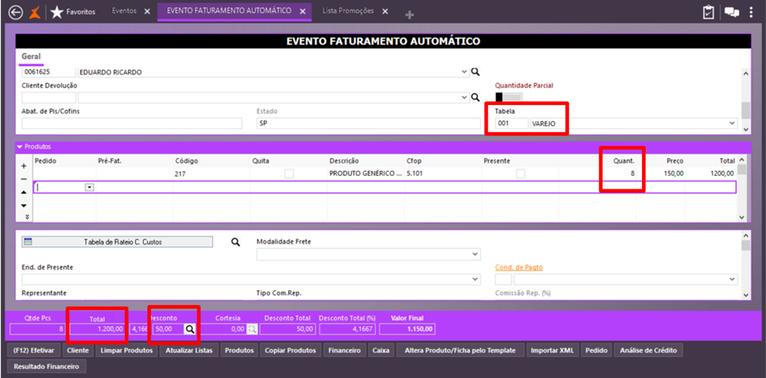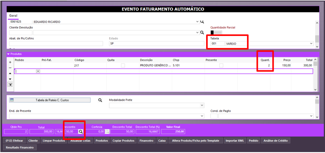 Na tela do evento de faturamento, ao serem lançadas as quantidades dos produtos, o sistema detecta que a regra da promoção foi atendida e aplica o desconto em valor. Perceba que a cada R$ 400,00 o sistema lançou R$ 70,00 de desconto.