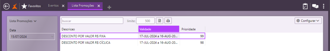 Analisando duas promoções cadastradas e ativas no sistema, temos que a promoção fixa por quantidade tem prioridade em relação à promoção cíclica por valor.