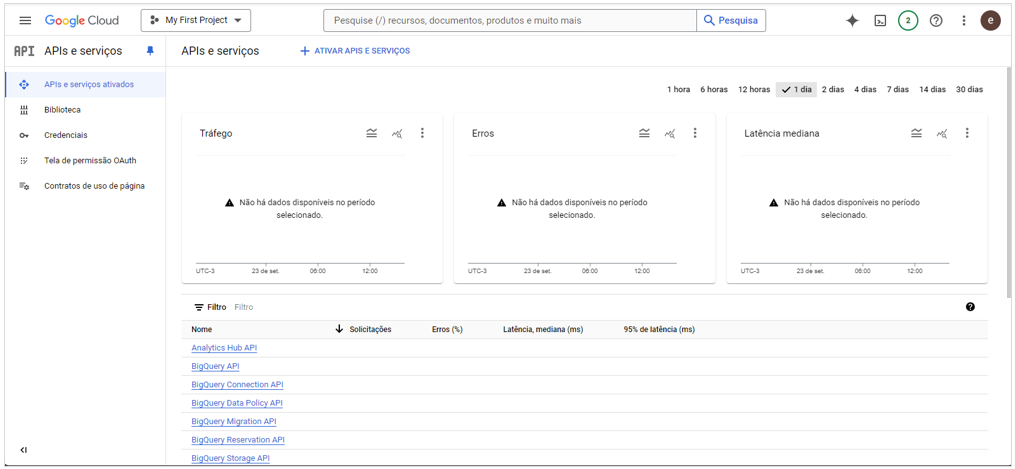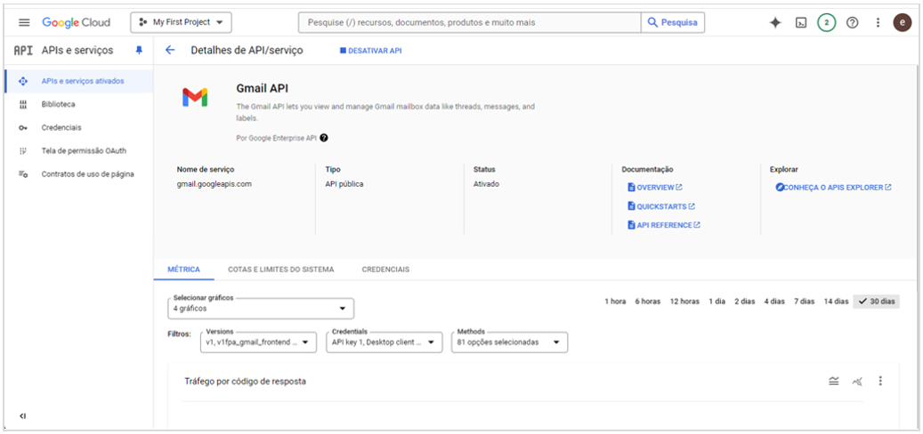 - Clique em API e serviços ativados;