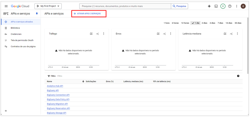 - Encontre e clique sobre + Ativar APIS E SERVIÇOS;