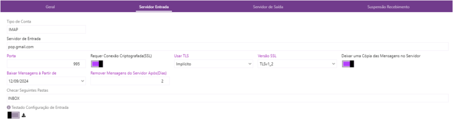 - Aba Servidor Entrada, configurar conforme imagem abaixo: