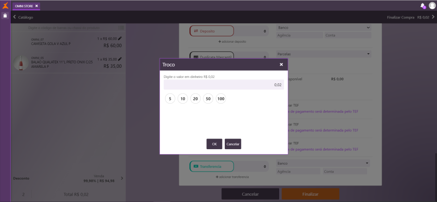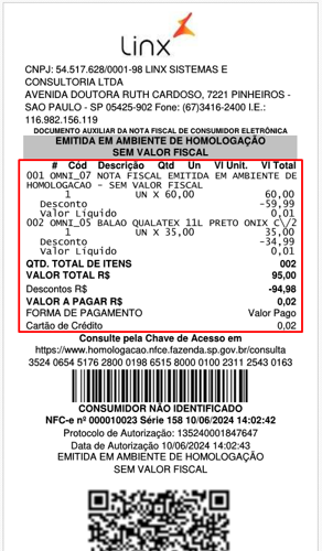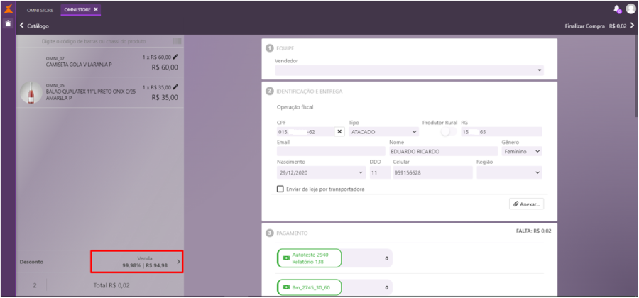 - Observe também que no total da venda consta o valor de R 0,02. Isso é uma exigência da legislação fiscal, que não permite a emissão de notas fiscais com valor zero, portanto o sistema lançou R$ 0,01 para cada produto da venda;