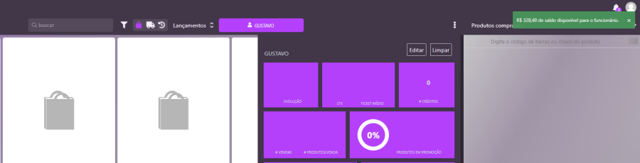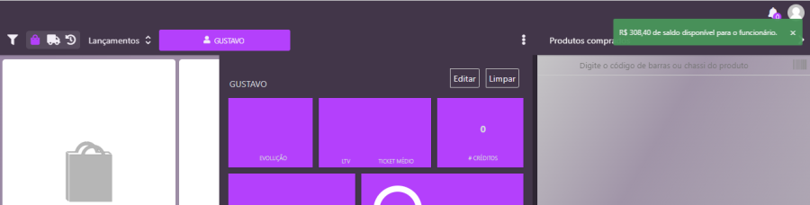 Assim que o funcionário for identificado pelo sistema, será exibido na tela o saldo do valor permitido de venda para ele.