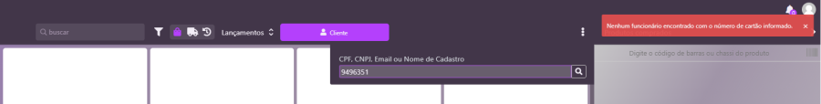 Na tela de vendas do PDV OMNI, no campo de busca de clientes, informe o número do crachá do funcionário. Caso o funcionário não esteja cadastrado no APData, o sistema irá realizar a busca no banco de do e-Millennium, que poderá ser realizada por nome, CPF, CNPJ e e-mail.