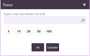Vá para a tela de finalização da venda novamente e selecione a forma de pagamento, que poderá ser DINHEIRO OU CARTAO. Se for dinheiro, na tela de troco, digite o valor da venda e clique em OK.