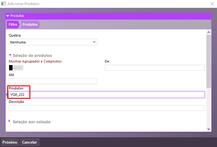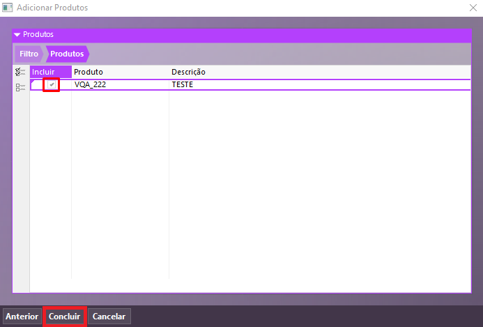Na guia Produtos, marque o checklist e clique em Concluir.