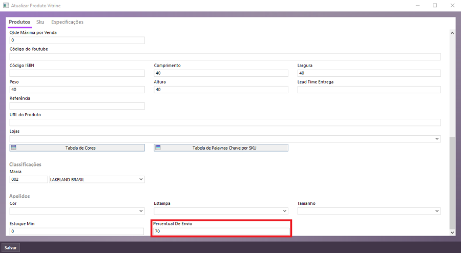 Para incluir o percentual de envio no nível do produto, na tela Vitrine de Produtos, com o produto selecionado, basta clicar no botão Alterar Produto. Será aberta a tela Atualizar Produto Vitrine. Na guia Produtos, no campo Percentual de Envio, digite o valor. Clique em Salvar.