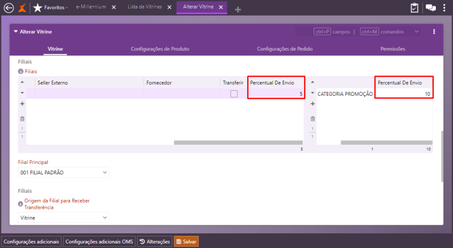 Na tela Alterar Vitrine, guia Vitrine, na tabela Filiais, inclua em Percentual de Envio e, em Categoria, os respectivos percentuais de envio.