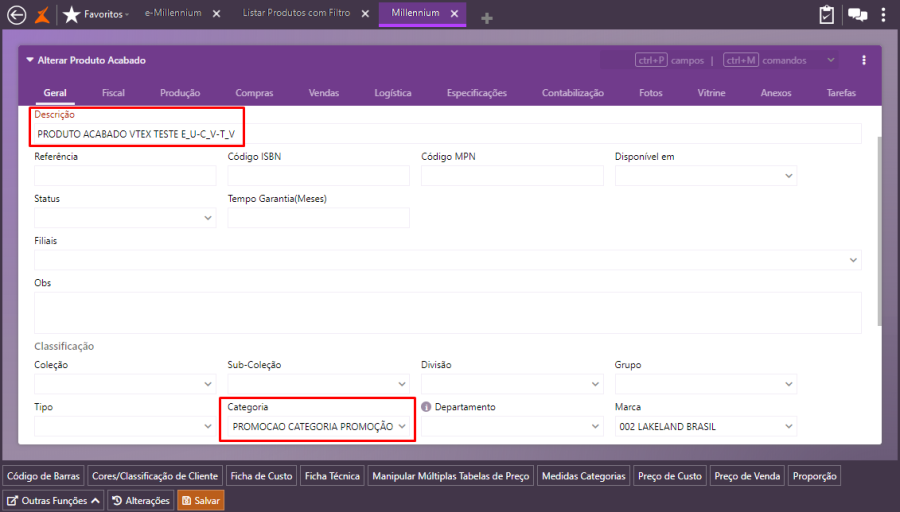 Na tela Alterar Produto Acabado, guia Geral, seção Classificação, no campo Categoria, selecione a categoria;