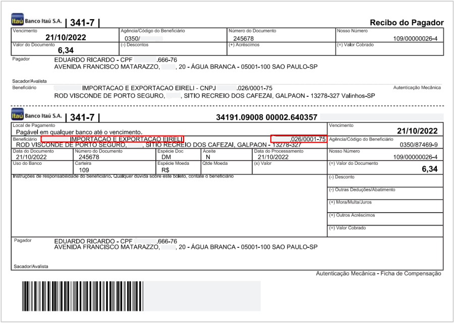 Modelo de boleto impresso para o tipo de pagamento BOLETO ITAÚ.