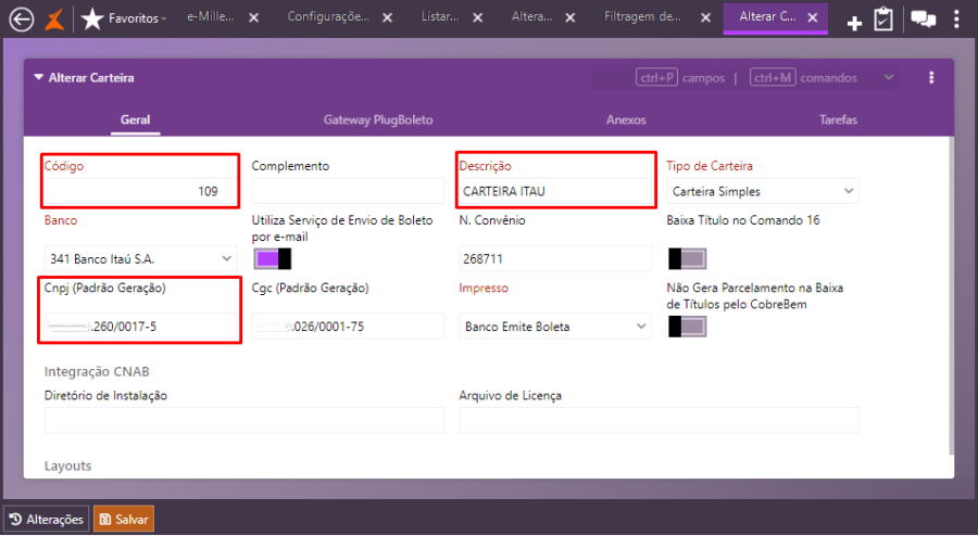 Na tela Alterar Carteira, guia Geral, preencha o campo CNPJ (Padrão Geração);