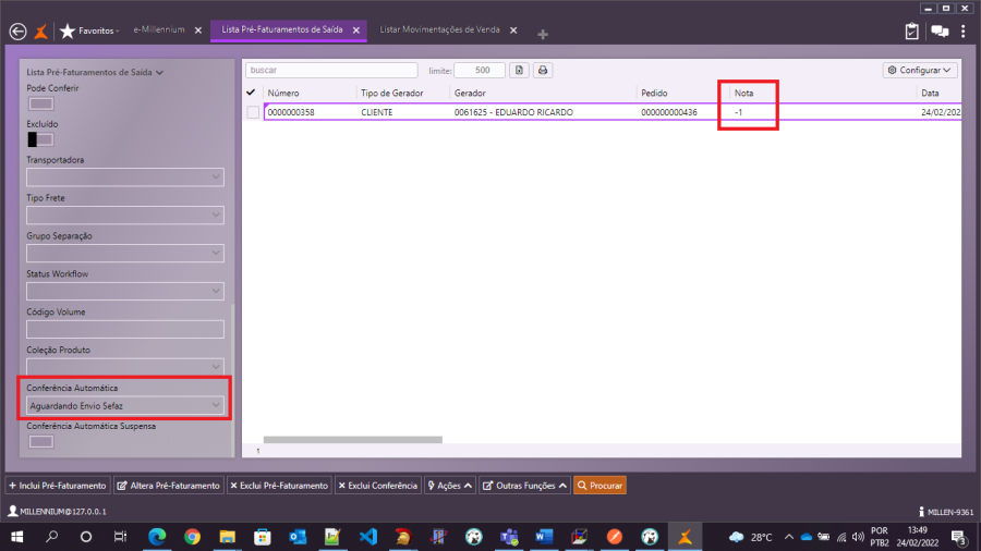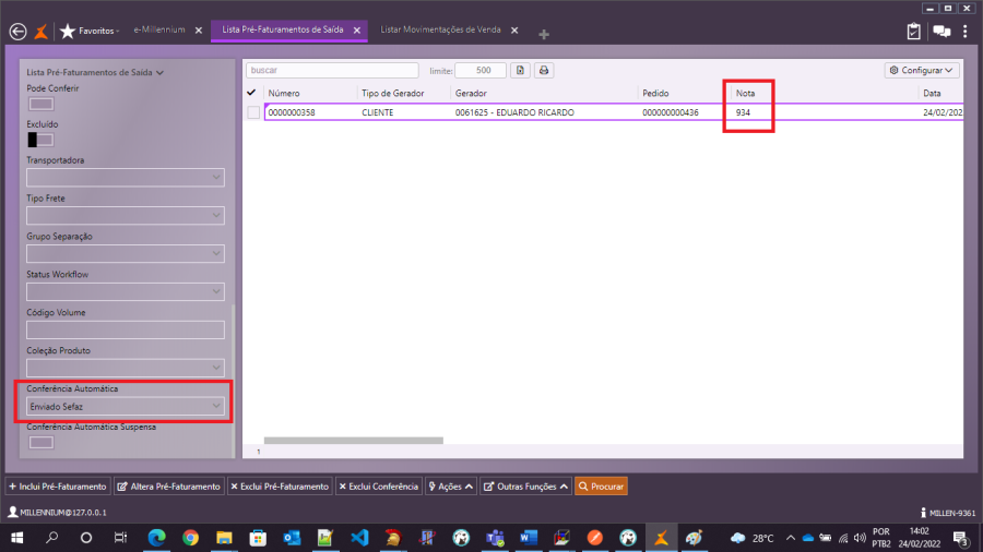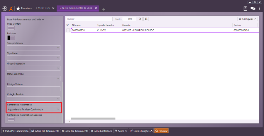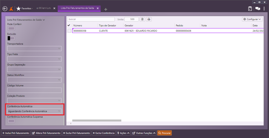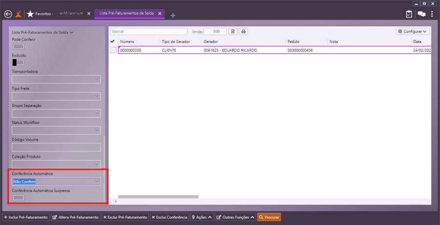 Libere o pré-faturamento da conferência automática, seguindo os passos abaixo (as informações foram usadas apenas como exemplo):