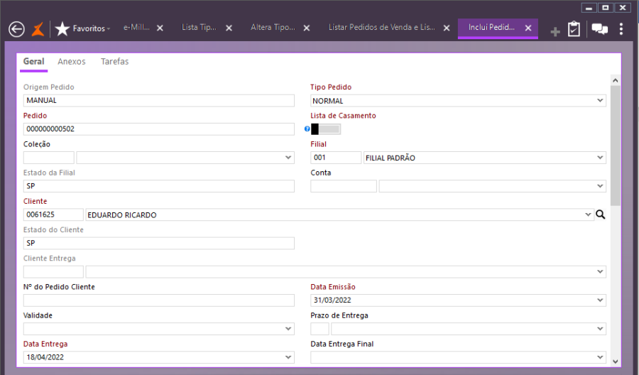 Na tela Inclui pedido de venda, guia Geral, informe os campos abaixo (as informações foram usadas apenas como exemplo):