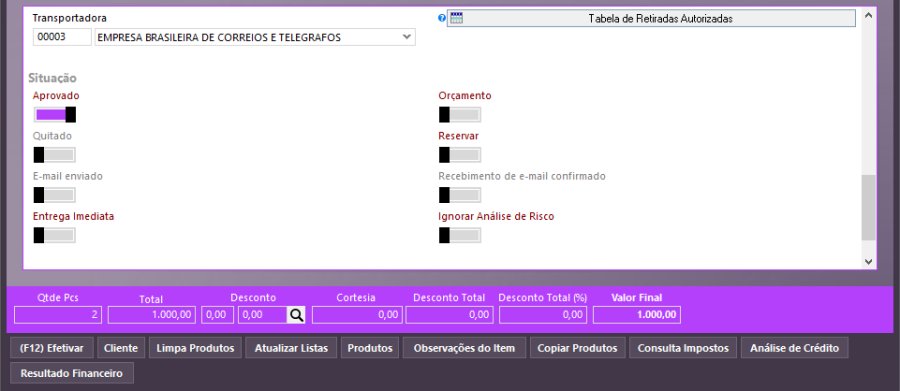 - Transportadora: 00003 – EMPRESA BRASILEIRA DE CORREIOS E TELÉGRAFOS