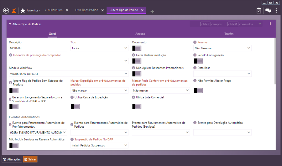 Na tela Altera Tipo de Pedido, guia Geral, seção Eventos Automáticos, no campo Evento para Faturamento Automático de Pré-faturamentos, selecione o evento para utilizar no processo.