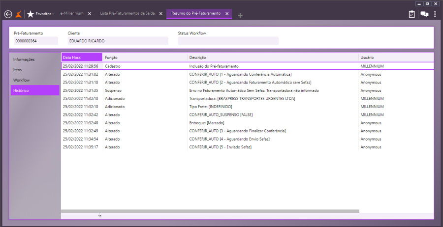 Importante! Para acompanhar a situação do pré-faturamento, selecione-o e clique em Ações/Resumo do Pré-Faturamento. No Histórico estarão todas as funções realizadas com o pré-faturamento.