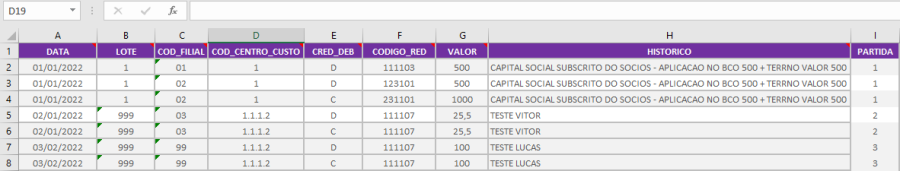 Possuir uma pasta com os arquivos .xlsx, com os dados para importação. A tabela deve estar formatada de acordo com as colunas da imagem abaixo: Data, Lote, Código Filial, Código Centro de Custo, Crédito/Débito, Código Red, Valor e Histórico e Partida.
