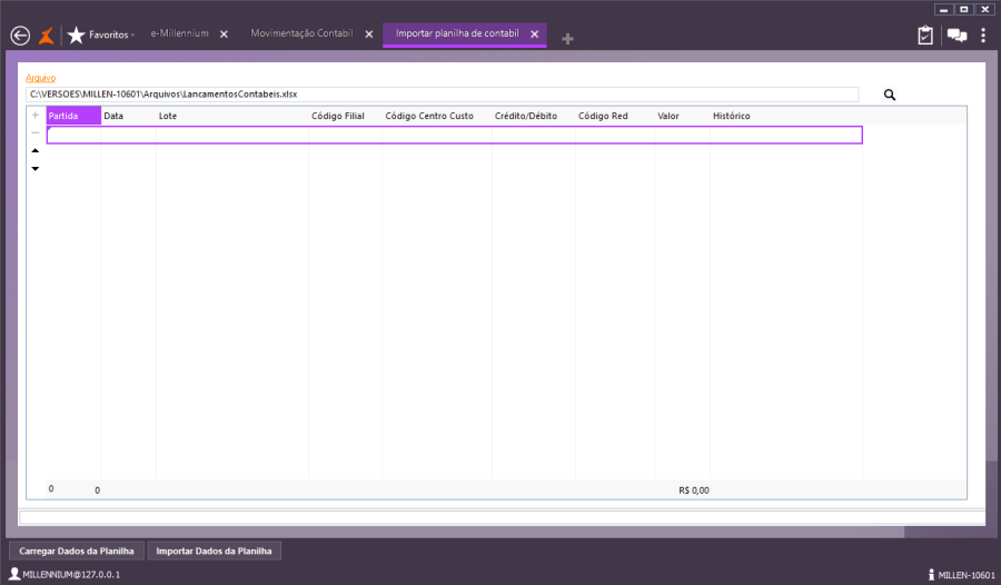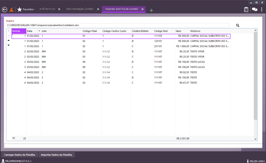 Você verá todas as partidas contábeis por Data, Lote, Código Filial, Código Centro de Custo, Crédito/Débito, Código Red, Valor e Histórico. Clique em Importar Dados da Planilha.