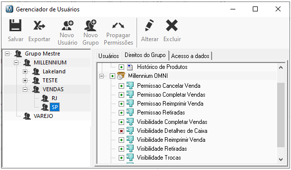 Nos casos em que a empresa optar por não dar acesso aos usuários para visualizarem os resultados das vendas, é possível configurar o sistema para inibir as informações no ato do fechamento do caixa. Acesse o Gerenciador de Usuários do Millennium ERP, selecione os usuários, ou grupo de usuários, que não terão acesso aos detalhes do fechamento de caixa e bloqueie a opção Visibilidade Detalhes de Caixa.