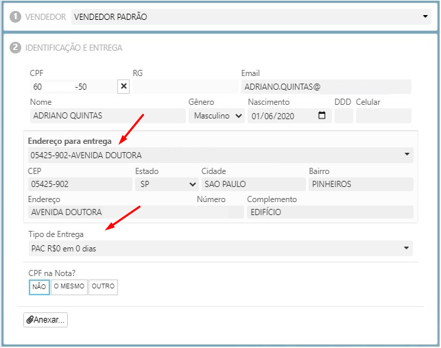 Inclua os demais produtos no pedido e clique em Total. A seguir, confira os dados do cliente, selecione o endereço para a entrega e o tipo de entrega. |
