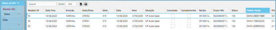 Em Vendas\Status NFe, a nota fiscal emitida para o pedido de venda final 7869, poderá ser consultada e o Danfe poderá ser visualizado e impresso.