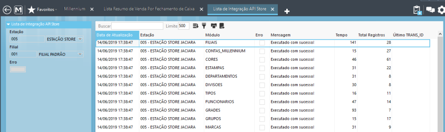 Exibirá, na tela, a listagem com todos os fatos ocorridos durante as integrações de dados entre o Millennium e o Store Manager. Se houver algum erro durante a integração, esta é a tela que o usuário deverá consultar para identificar a tabela na qual o erro ocorreu.